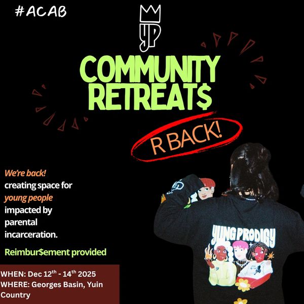 As part of Youth Week 2024, Yung Prodigy is holding so called Australia’s first-ever collective retreat for young people who have/had lived experience or impact of parental incarceration. Over two days, young people will gather together to learn and share in creativity, discovery, mapping and storytelling. As a collective, we will create Australia’s first space by us, for us, and a community campaign for future awareness. We believe lived experience is important, and we're here to welcome and champion the forgotten victims of this system so that together we can make an impact on the issues that matter most to us. Designed for and by people with lived experience, we hope this retreat and the activities shared will serve as a space for our unserved and overlooked community. EOI's are now open until 22nd March 2024 - email maia@yungprodigy.org to show interest or learn more.
